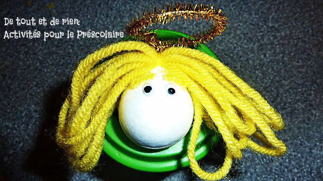 Subséquemment, j'ai enfilé, par le haut de la bouteille, l'enveloppe protectrice pour les fruits en guise de robe. Il ne me restait plus qu'à coller les ailes à la bouteille et de visser le bouchon-tête. J'ai essayé avec de la colle blanche puisque j'ai tout épuisé mes munitions de bâtonnets de colle chaude, mais je vous conseille fortement d'utiliser d'emblée cette dernière. J'ai terminé en insérant une petite lumière DEL. Voilà! L'ange est terminé! Ceci était mon prototype. Maintenant, je compte la refaire avec mon fils. Cette activité est bonne pour la coordination main-oeil, la motricité fine et pour un rapprochement mère et fils!
