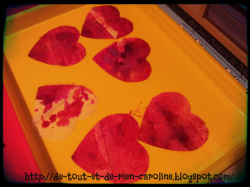 Aujourd'hui, mes jeunes trottineurs de 2 ans ont coloré des coeurs parfumés. Hier, j'ai découpé des coeurs dans des feuilles assouplissantes pour la sécheuse. Ce matin, à l'aide de compte-gouttes, les enfants ont peinturé les jolis coeurs parfumés.