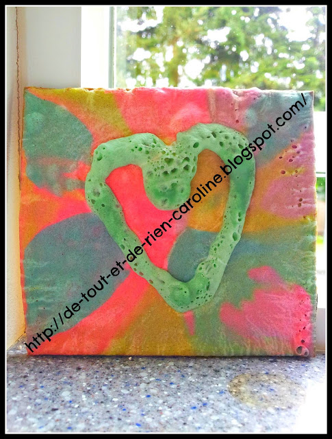 Sur la photo ci-dessous, vous pouvez voir que j'ai superposé 2 couches. En fait, j'ai fait une première couche et je l'ai mis au micro-ondes. Ensuite, j'ai dessiné une forme de coeur sur la première couche et j'ai mis le tout et four micro-ondes à nouveau.