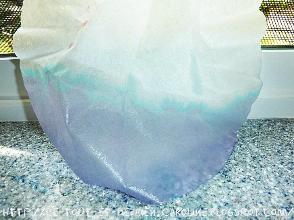 L'eau était foncée dans le contenant, donc, nous avons trempé un filtre à café pour constater que la couleur est mauve. "Rouge et bleu donnent la couleur mauve!" de me dire mon fils, tout enthousiaste.