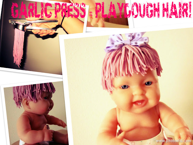 Quelle belle activité et oh! combien nous avons ri. Nous nous sommes amusés à faire des cheveux à notre poupée avec l'aide d'un presse-ail. Cet outil de cuisine se manipule mieux que ceux vendus dans les magasins, selon moi. Si vous avez préparé un salon de coiffure dans votre coin dramatique, cette activité ajouterait au réalisme du jeu! En effet, les enfants pourraient couper les cheveux en pâte à modeler de la poupée.